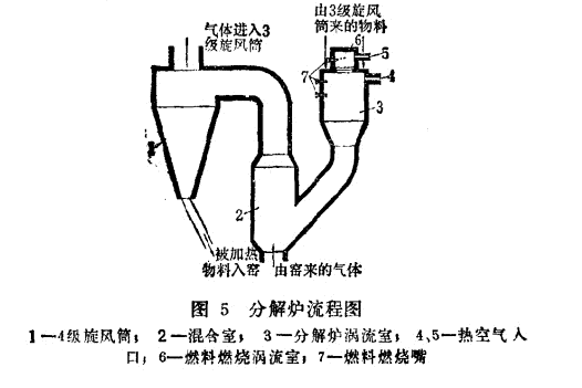 為了調(diào)整氣體動力學制度,分解爐內(nèi)設(shè)有節(jié)流閘板,它位于混合室的圓錐形異徑管下部。分解爐工作的特性為:它完全依賴于回轉(zhuǎn)窯的操作制度。分解過的生料粉進入渦流室同回轉(zhuǎn)窯出來的熱廢氣相混合,并依靠廢氣熱令生料粉達到85-90%的分解。從混合室出來的含生料粉的氣體進入第四級旋風筒,生料粉在該筒內(nèi)與氣流分開,并沿傾斜溜管進入回轉(zhuǎn)窯內(nèi)。
