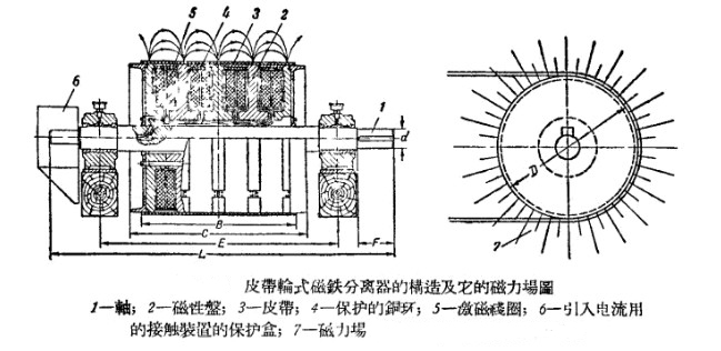 在皮帶輪式分離器內(nèi),沿著輪子的轉(zhuǎn)動其表面會產(chǎn)生強(qiáng)大的磁場,在較小直徑處的磁場達(dá)到750-900奧斯特,較大直徑處磁場達(dá)到1200-1400奧斯特,當(dāng)即將進(jìn)行球磨機(jī)粉碎的物料內(nèi)金屬塊落到這個磁場時(shí),就會被吸進(jìn)并貼在筒上,然后脫落而被皮帶擲落到分離器下方的特殊卸斗內(nèi)。其具體結(jié)構(gòu)如圖: